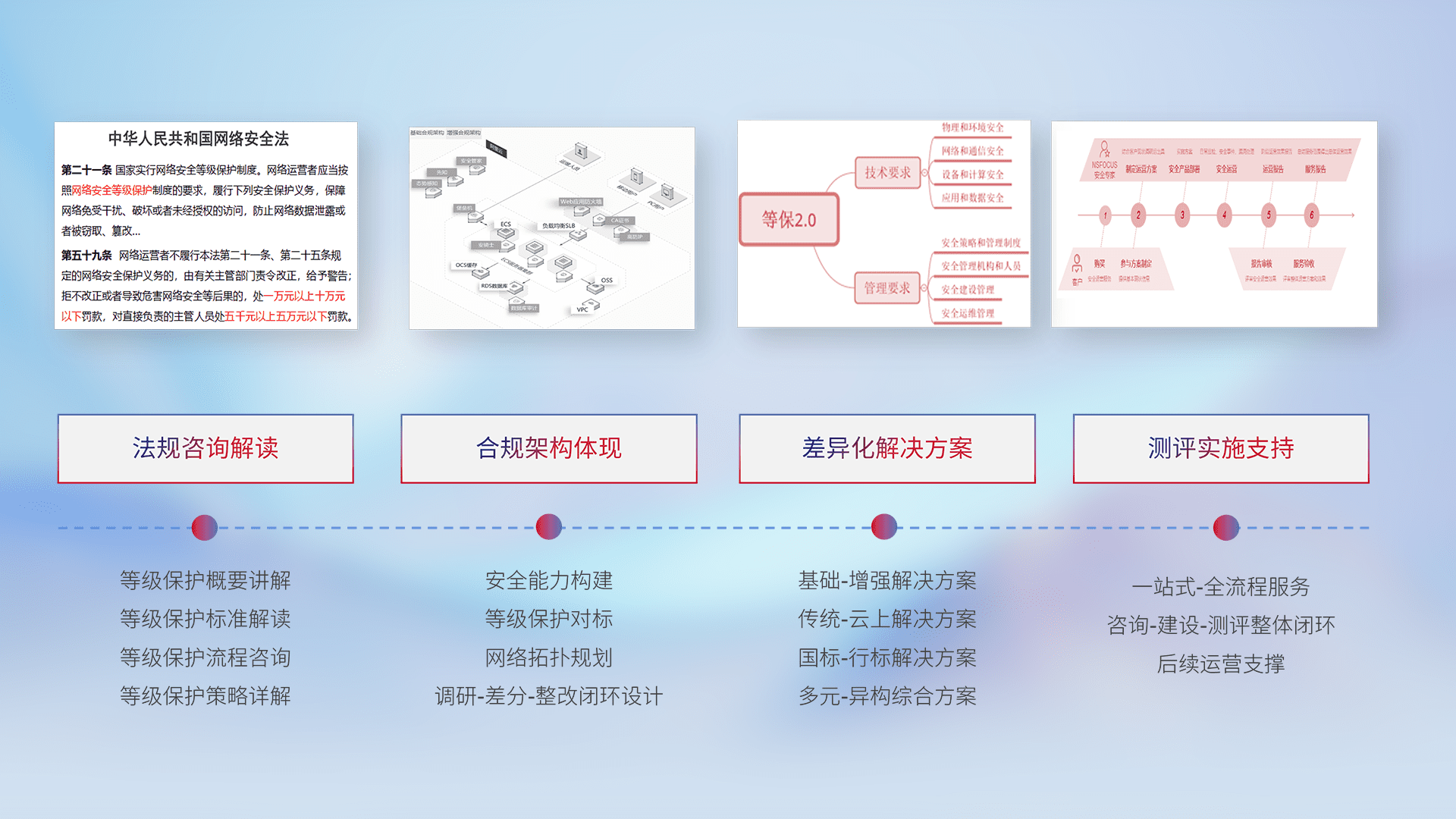 通过专业的法律咨询解读、、、合规架构体现、、、、差异化解决方案、、测试实施支持等服务,,,,为客户量身打造等保合规体系。。