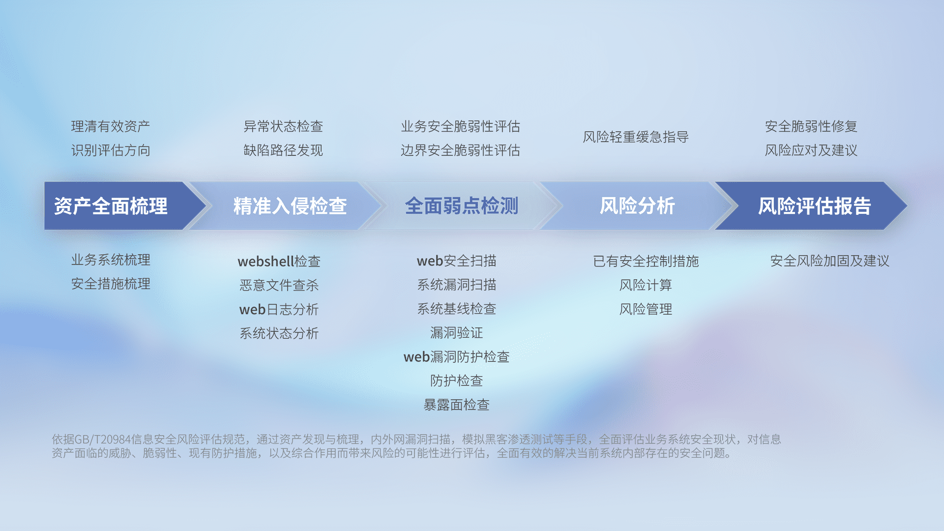 针对客户行业特性,,,,以专业的安全服务+多厂商联合解决方案提供专属的一站式安全管理服务,,帮助客户全面感知网络空间威胁,,,基于识别、、检测、、、、分析、、防护、、、监测、、响应的服务理论模型,,,,从方案咨询、、、集成交付、、、评估验证、、优化加固、、、运维运营,,致力于为客户提供完整的闭环管理式安全服务。。。。以实战经验为客户打造高抵御风险的安全体系,,,帮助客户发现威胁、、对抗威胁、、、处置威胁,,,不断积累安全对抗能力,,,,持续保障数字化安全。。。。